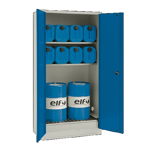 Ventilerbart oljeskap har plass til oppbevaring av 8x 20 liter + 2x 60 liter, eller 16x 20 liter oljedunkter. Skapet er konstruert med oppsamlingsbeholder til minimum 60 liter og overholder sådan krav til oppbevaring av oljeprodukter. Skapene har talerkenventil i høyre side og utsugingsdyse i toppen, samt 2 galvaiserte hyller. Skapet er låsbart.
